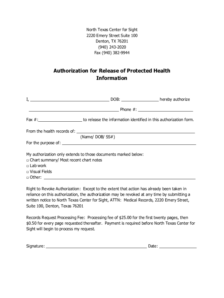 North Texas Center for Sight 2220 Emery Street Suite 100 Denton, TX 76201 (940) 2432020 Fax (940) 3829944Authorization for Release of Protected Health Information, ___ DOB: ___ hereby authorize ___