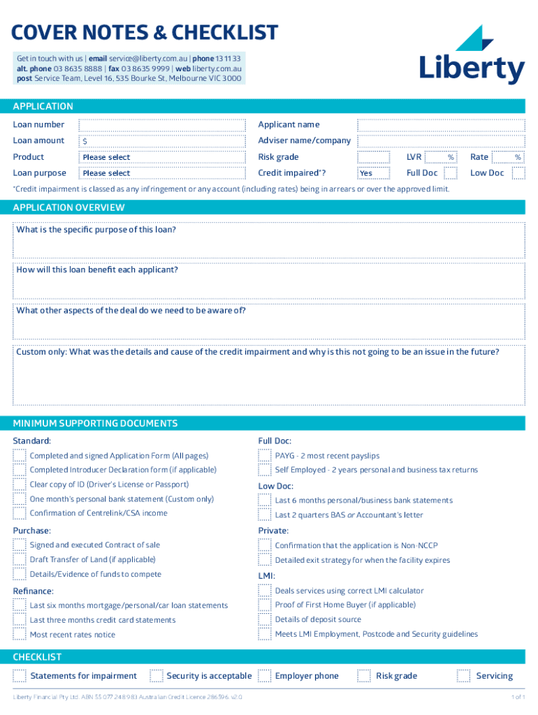 COVER NOTES & CHECKLIST Get in touch with us | email service@liberty.com.au | phone 13 11 33 alt. Phone 03 8635 8888 | fax 03 8635 9999 | web liberty.com.AU post Service Team, Level 16, 535 Burke