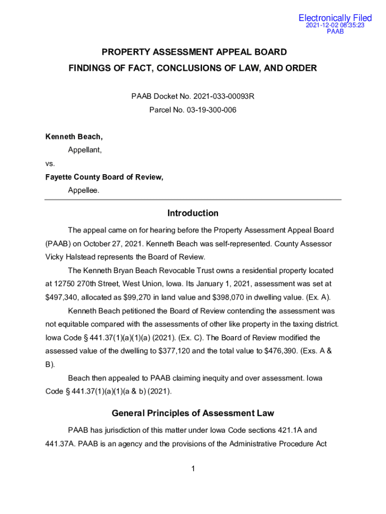Electronically Filed 20211202 08:35:23 PAABPROPERTY ASSESSMENT APPEAL BOARD FINDINGS OF FACT, CONCLUSIONS OF LAW, AND ORDER SAAB Docket No. 202103300093R Parcel No. 0319300006 Kenneth Beach, Appellant,
