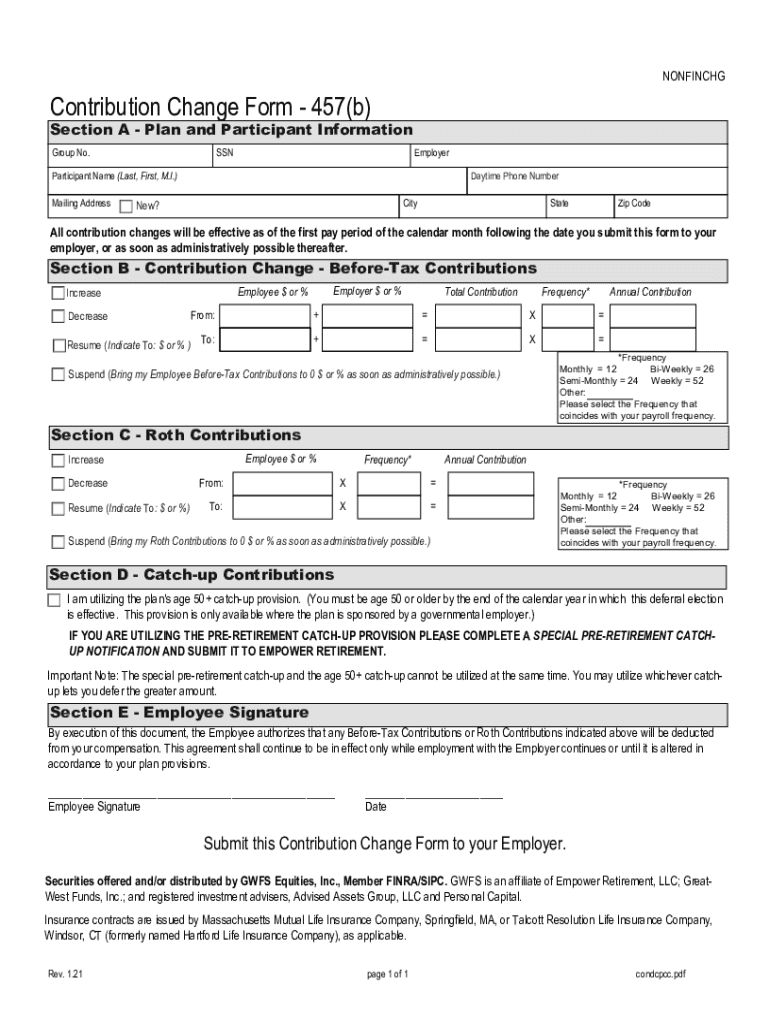 NONFINCHGContribution Change Form 457(b)Section A Plan and Participant Information Group No.SSNEmployerParticipant Name (Last, First, M.I.) Mailing AddressDaytime Phone Number City? State Odell contribution