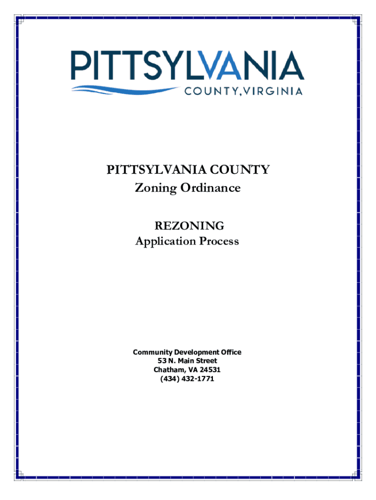 PENNSYLVANIA COUNTY Zoning Ordinance REZONING Application ProcessCommunity Development Office 53 N. Main Street Chatham, VA 24531 (434) 4321771PITTSYLVANIA COUNTYREZONING PROCESS STEP 1: REAPPLICATION: