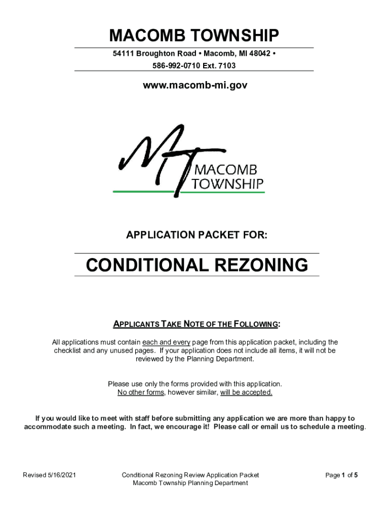 MACOMB TOWNSHIP 54111 Brought on Road Macomb, MI 48042 5869920710 Ext. 7103www. Macomb.application PACKET FOR:CONDITIONAL REZONING APPLICANTS TAKE NOTE OF THE FOLLOWING: All applications must contain