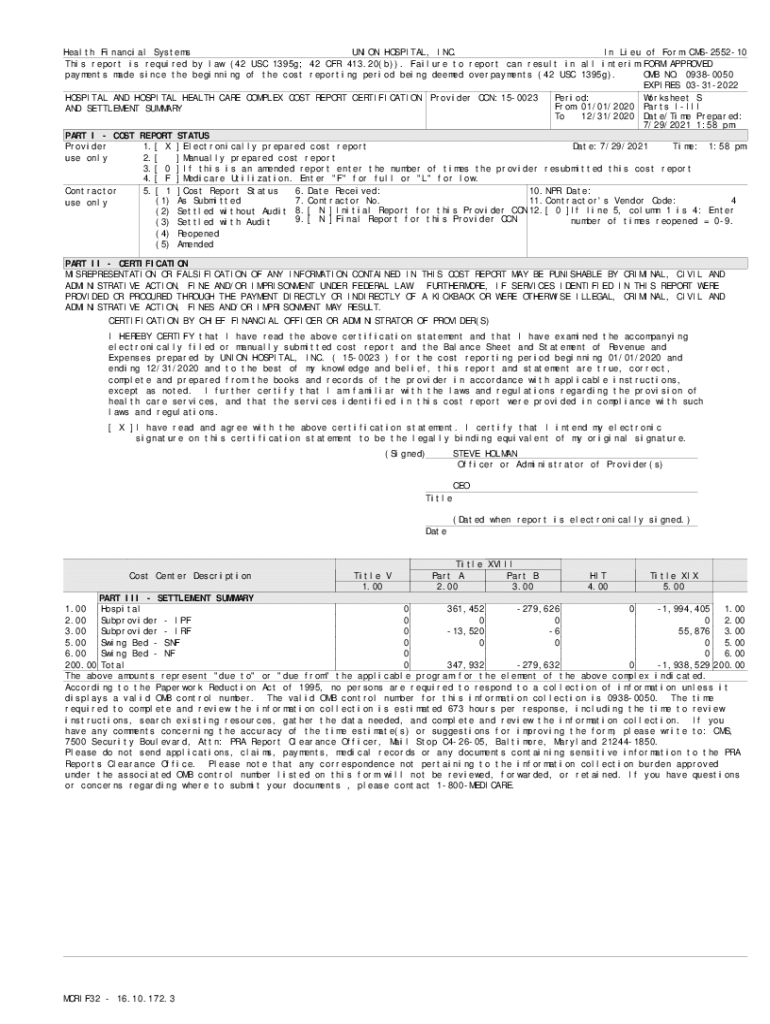 Health Financial Systems UNION HOSPITAL, INC. In Lieu of Form CMS255210 This report is required by law (42 USC 1395g; 42 CFR 413.20(b)). Failure to report can result in all interim FORM APPROVED payments