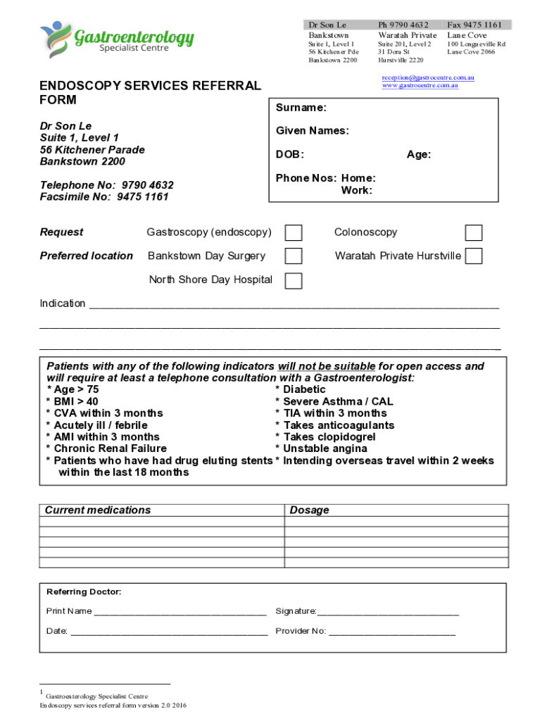 ENDOSCOPY SERVICES REFERRAL FORM Dr Son Le Suite 1, Level 1 56 Kitchener Parade Bankstown 2200Dr Son Le Bankstown 9790 4632 Warmth Private 9475 1161 Lane Cohesive 1, Level 1 56 Kitchener Pie Bankstown