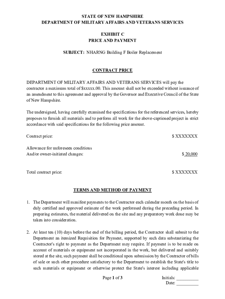 STATE OF NEW HAMPSHIRE DEPARTMENT OF MILITARY AFFAIRS AND VETERANS SERVICES EXHIBIT C PRICE AND PAYMENT SUBJECT: SHARING Building F Boiler ReplacementCONTRACT PRICE DEPARTMENT OF MILITARY AFFAIRS