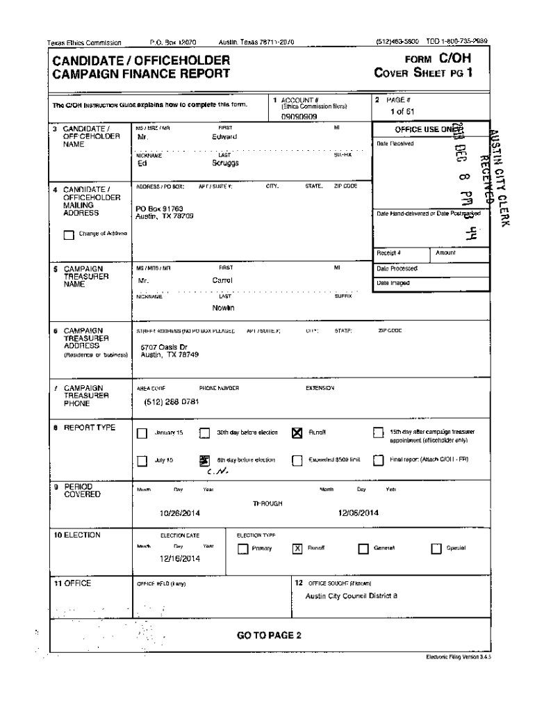 (512)4635800Austin. Texas 787112070P. O. Box 12070Texas Ethics Commissioner C/CANDIDATE / OFFICEHOLDER CAMPAIGN FINANCE REPORTER SHEET PG 1 21 ACCOUNT* (Ethics Commission filers)The C/OH INSTRUCTION