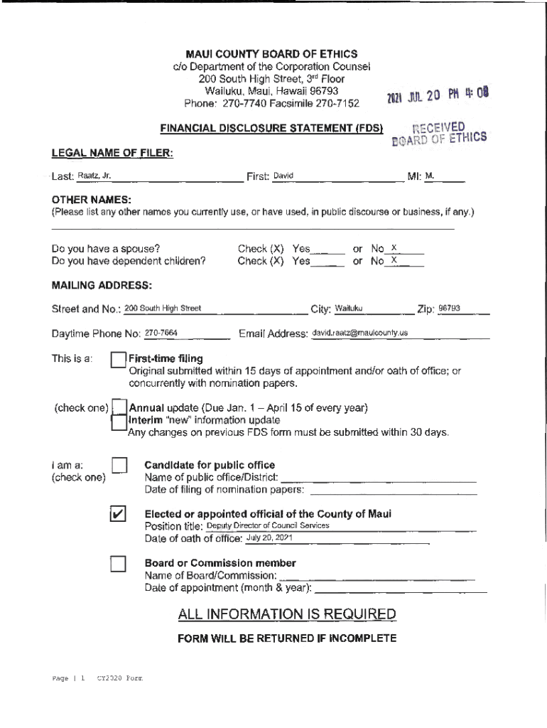 Maul COUNTY BOARD OF ETHICS c/o Department of the Corporation Counsel 200 South High Street, 3rd Floor Wailuku, Maui, Hawaii 96793 Phone: 2707740 Facsimile 2707152lOll JUL 20 PK l: Financial DISCLOSURE