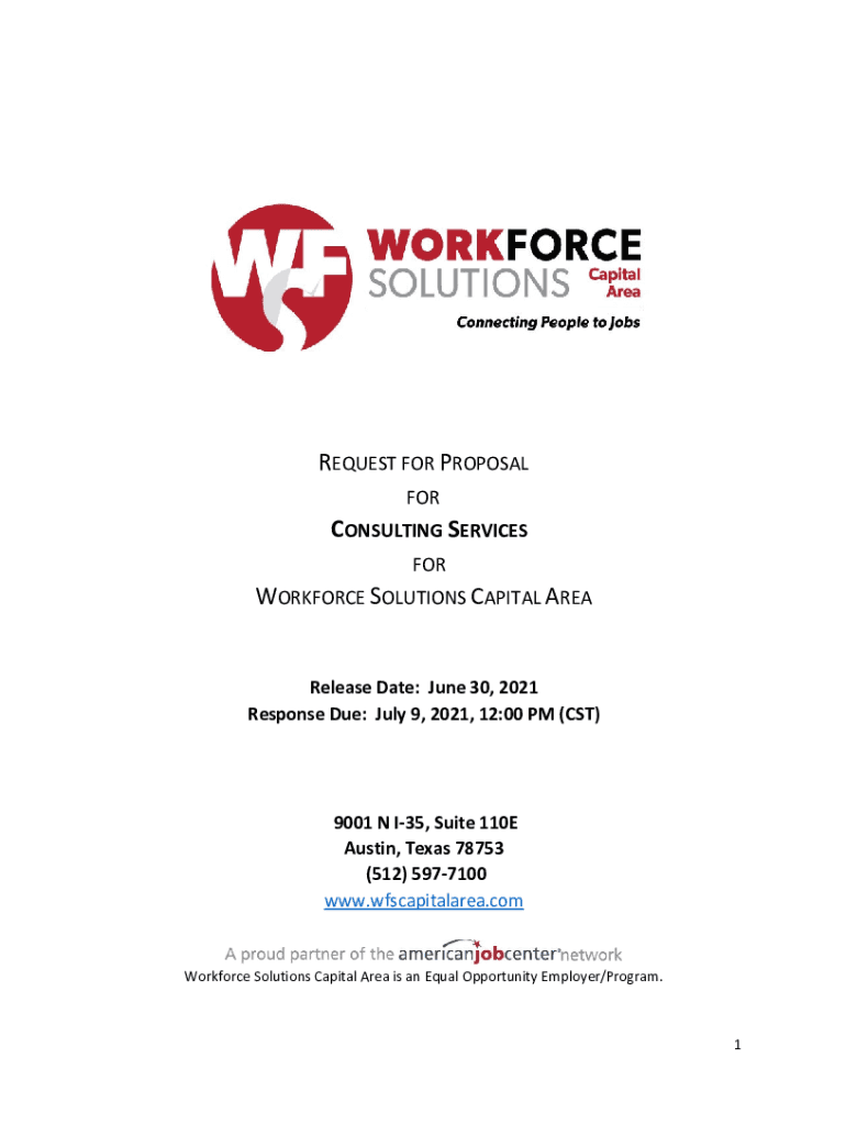 REQUESTFORPROPOSAL FORCONSULTINGSERVICES FORWORKFORCESOLUTIONSCAPITALAREA Release Date:June30,2021 Response:July9,2021,12:00PM(CST) 9001NI35,Suite110EAustin,Texas78753 (512)5977100 www.wfscapitalarea.com