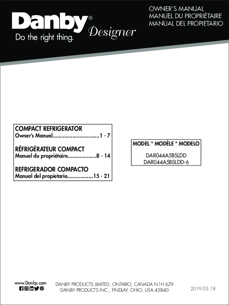 OWNERS MANUAL MANUEL DU PROPRIETARY MANUAL DEL PROPIETARIOCOMPACT REFRIGERATOR Owners Manual...............................1 7RFRIGRATEUR COMPACT Manuel Du proprietary...................8 14MODEL