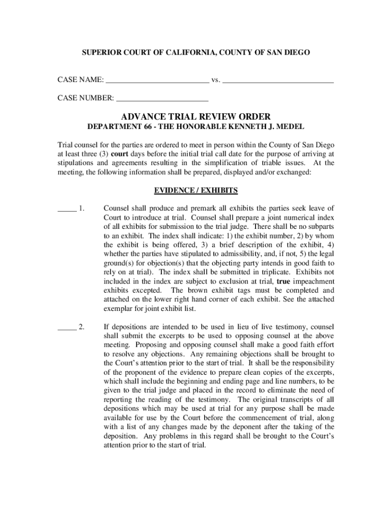SUPERIOR COURT OF CALIFORNIA, COUNTY OF SAN DIOCESE NAME: ___ vs. ___ CASE NUMBER: ___ADVANCE TRIAL REVIEW ORDER DEPARTMENT 66 THE HONORABLE KENNETH J. MODEL Trial counsel for the parties are ordered