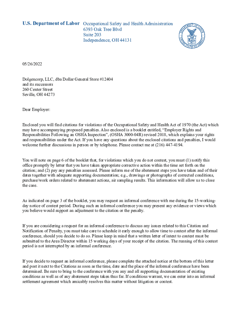 U.S. Department of Labor Occupational Safety and Health Administration 6393 Oak Tree Blvd Suite 203 Independence, OH 4413105/26/2022 Dolgencorp, LLC, DBA Dollar General Store #12404 and its successors
