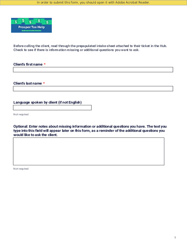In order to submit this form, you should open it with Adobe Acrobat Reader. Before calling the client, read through the prepopulated intake sheet attached to their ticket in the Hub. Check to see
