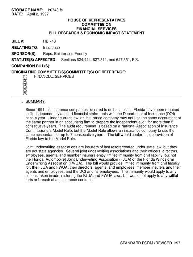 Get the free STANDARD FORM (REVISED 1/97) STORAGE NAME: h0743.fs ...