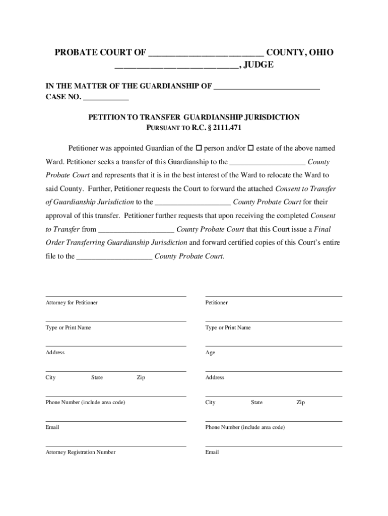 PROBATE COURT OF ___ COUNTY, OHIO ___, JUDGE IN THE MATTER OF THE GUARDIANSHIP OF ___ CASE NO. ___ PETITION TO TRANSFER GUARDIANSHIP JURISDICTION PURSUANT TO R.C. 2111.471 Petitioner was appointed