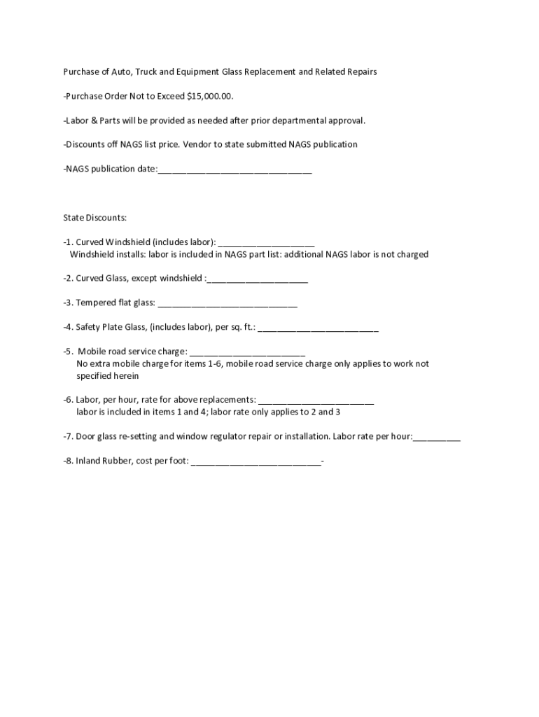 Purchase of Auto, Truck and Equipment Glass Replacement and Related Repairs Purchase Order Not to Exceed $15,000.00. Labor & Parts will be provided as needed after prior departmental approval. Discounts