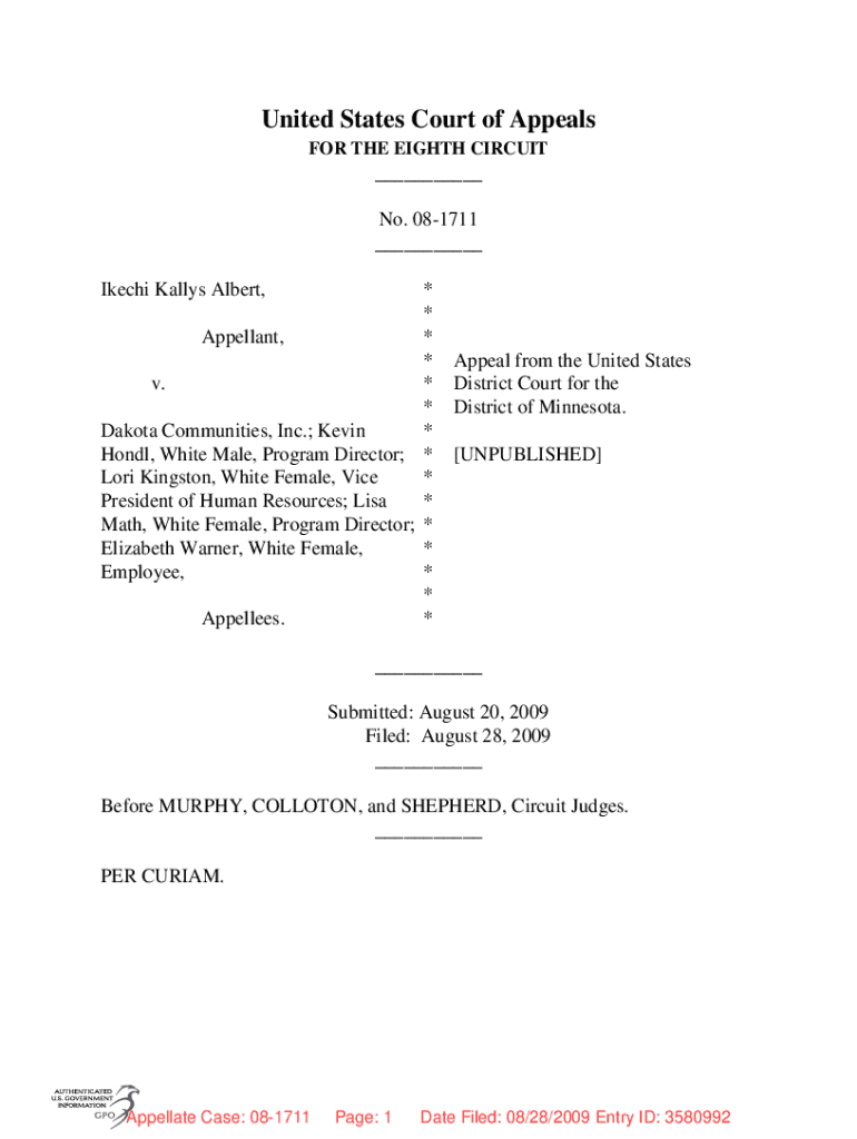 United States Court of Appeals FOR THE EIGHTH CIRCUIT___ No. 081711 ___ Ike chi Calls Albert, * * Appellant, * * v. * * Dakota Communities, Inc.; Kevin * Honda, White Male, Program Director; * Lori