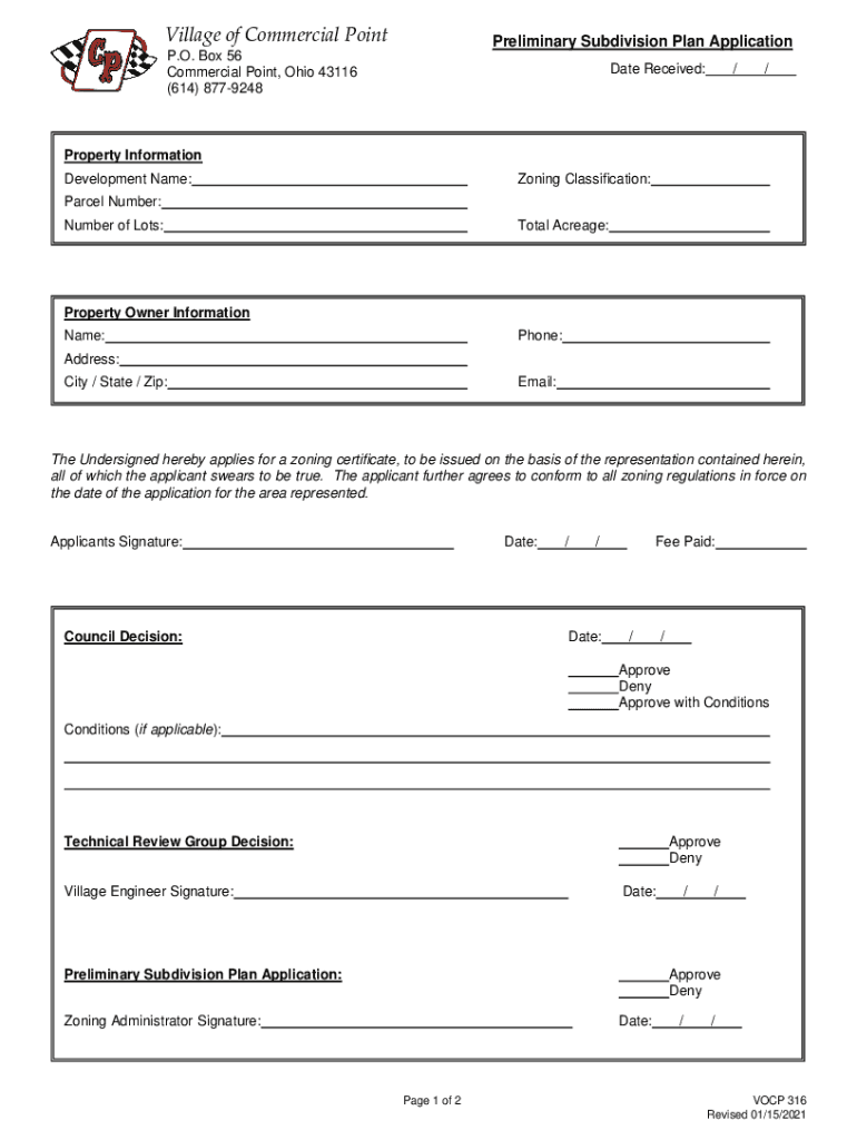 Village of Commercial PointPreliminary Subdivision Plan Application. O. Box 56 Commercial Point, Ohio 43116 (614) 8779248Date Received://Property Information Development Name:Zoning Classification:Parcel