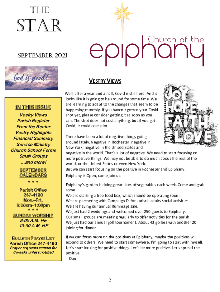 TheSTARVESTRY VIEW SIN THIS ISSUE Vestry Views Parish Register From the Rector Vestry Highlights Financial Summary Service Ministry Church School Forms Small Groups and more! SEPTEMBER CALENDARS *