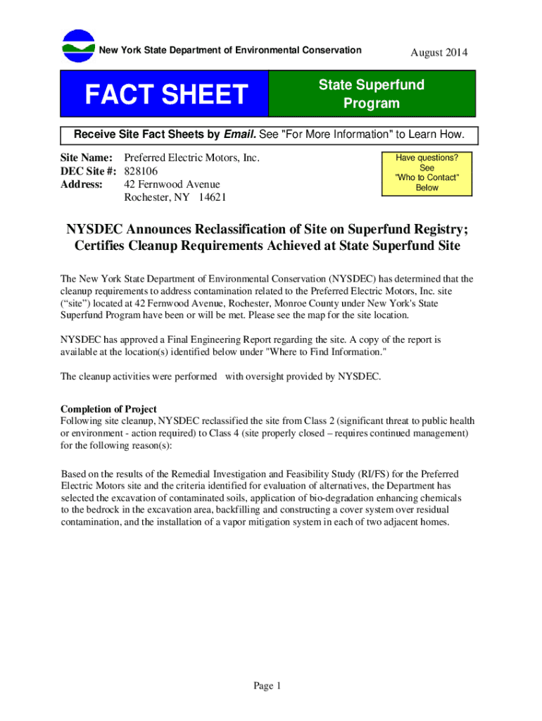 New York State Department of Environmental Conservation August 2014State Superfund ProgramFACT SHEETReceive Site Fact Sheets by Email. See \” For More Information\” to Learn How. Site Name: Preferred