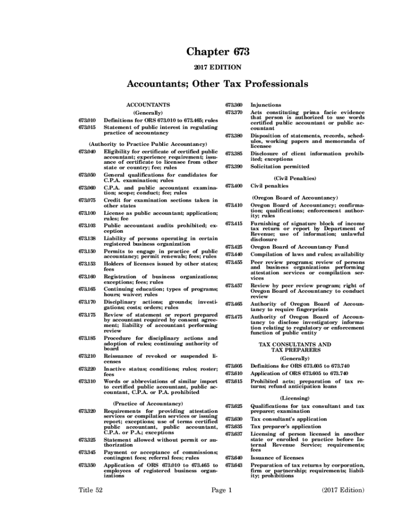Chapter 673 2017 EDITIONAccountants; Other Tax Professionals673.010 673.015ACCOUNTANTS (Generally) Definitions for ORS 673.010 to 673.465; rules Statement of public interest in regulating practice