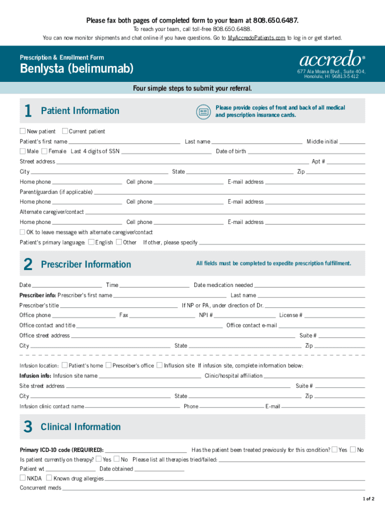 Please fax both pages of completed form to your team at 808.650.6487. To reach your team, call toll-free 808.650.6488. You can now monitor shipments and chat online if you have questions. Go to MyAccredoPatients.com
