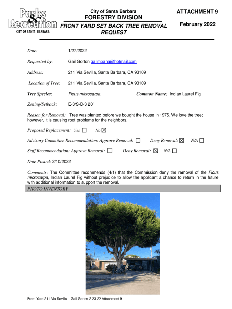 City of Santa BarbaraATTACHMENT 9FORESTRY DIVISION FRONT YARD SET BACK TREE REMOVAL REQUEST Date:1/27/2022Requested by:Gail Gordon gailmoana@hotmail.comAddress:211 Via Seville, Santa Barbara, CA 93109Location