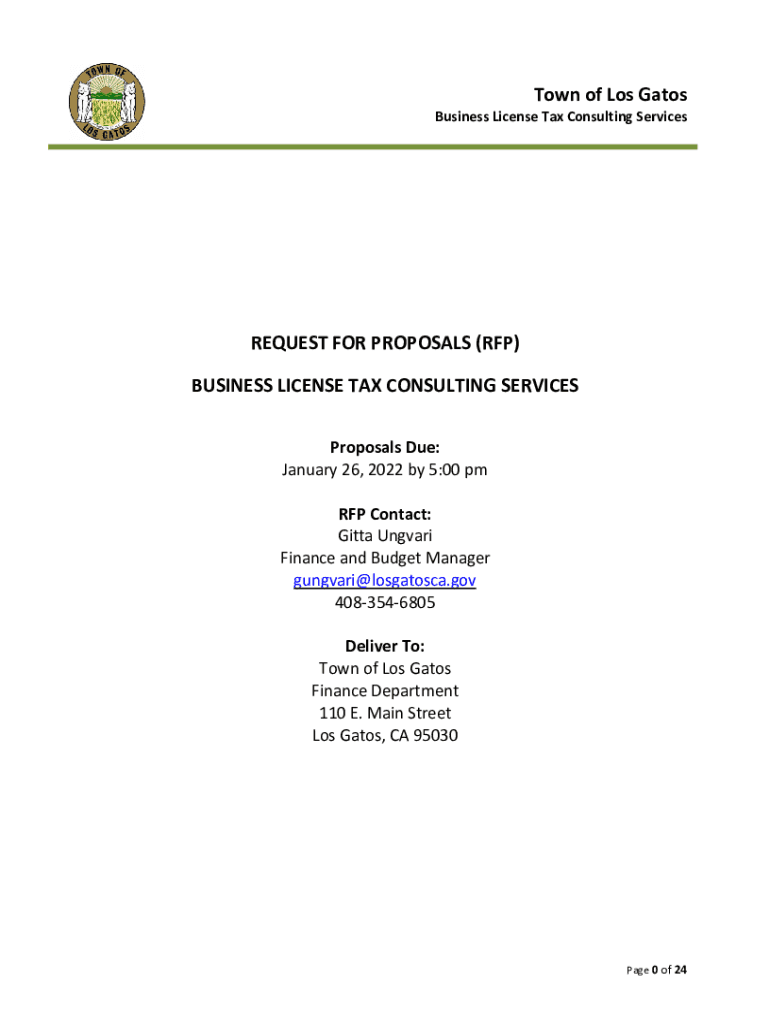 Town of Los GatosBusiness License Tax Consulting ServicesREQUEST FOR PROPOSALS (RFP) BUSINESS LICENSE TAX CONSULTING SERVICES Proposals Due: January 26, 2022, by 5:00 pm RFP Contact: Gotta Unguard