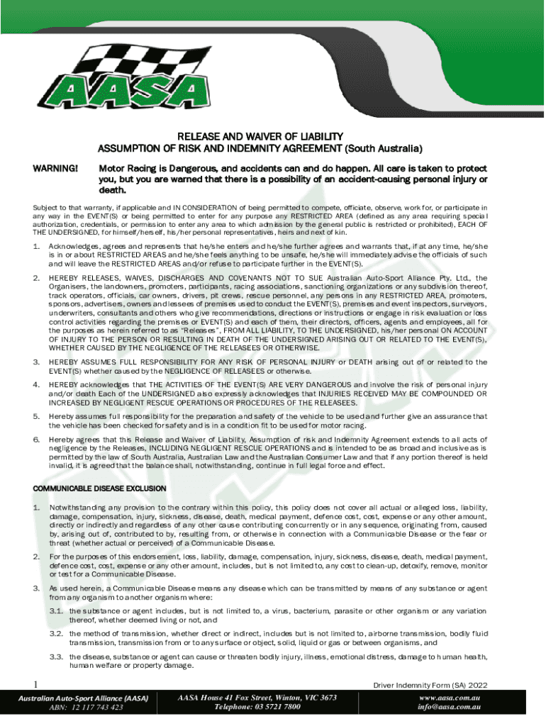 RELEASE AND WAIVER OF LIABILITY ASSUMPTION OF RISK AND INDEMNITY AGREEMENT (South Australia) WARNING! Motor Racing is Dangerous, and accidents can and do happen. All care is taken to protect you,