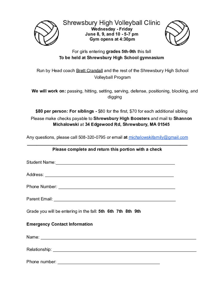 Shrewsbury High Volleyball Clinic Wednesday Friday, June 8, 9, and 10 57 pm Gym opens at 4:30pm For girls entering grades 5th9th this fall To be held at Shrewsbury High School gymnasium Run by Head