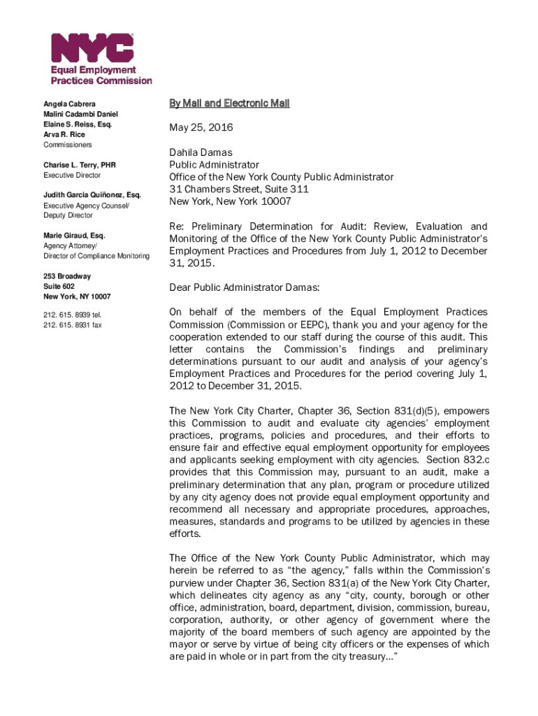 Angela Cabrera Main Adam Daniel Elaine S. Mass, Esq. ARVA R. Rice Commissioners Chaise L. Terry, PHR Executive Director Judith Garcia Quine, Esq. Executive Agency Counsel/ Deputy Directory Mail and