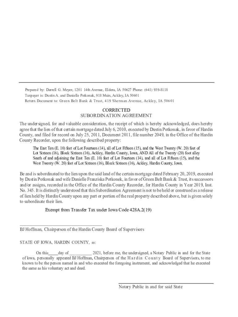 Prepared by: Darrell G. Meyer, 1201 14th Avenue, Elnora, LA 50627 Phones: (641) 9398118 Taxpayer is: Dustin A. and Danielle Potomac, 918 Main, Ackley, IA 50601 Return Document to: Green Belt Bank