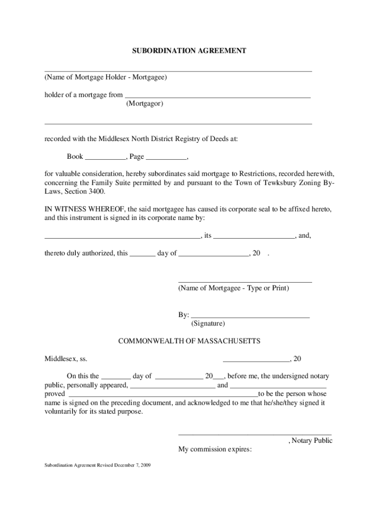 SUBORDINATION AGREEMENT ___ (Name of Mortgage Holder Mortgagee) holder of a mortgage from ___ (Mortgagor) ___ recorded with the Middlesex North District Registry of Deeds at: Book ___, Page ___, for