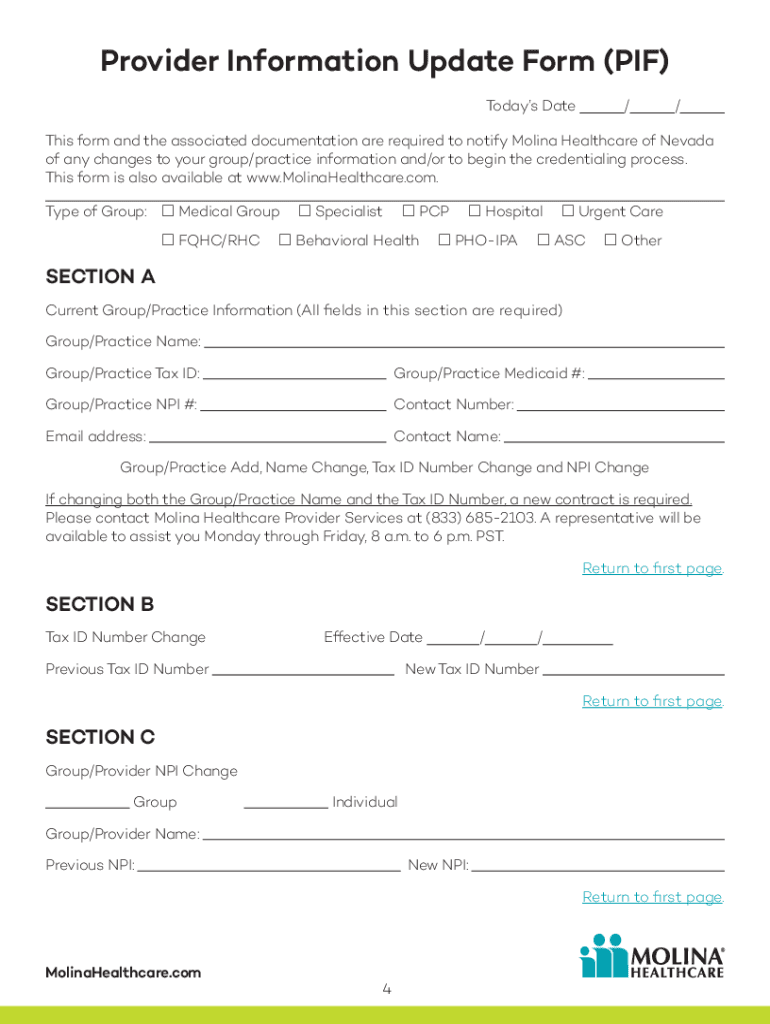 Guide to Provider Forms ACTION WILL NEED TO COMPLETE THE SECTIONS IDENTIFIED BELOW ON THE PROVIDER INFORMATION UPDATE FORM (PIF) AND ANY ADDITIONAL DOCUMENTS LISTED. ALL DOCUMENTS MUST BE COMPLETED