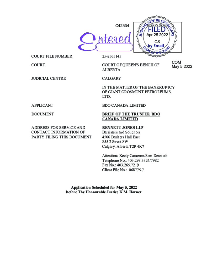 C42534CLERK\'S STAMPFILEDApr 25 2022 Cosby Email COURT FILE NUMBER252565145COURTCOURT OF QUEEN\'S BENCH OF ALBERTAJUDICIAL CENTRECALGARYCOM May 5 2022IN THE MATTER OF THE BANKRUPTCY OF GIANT EROSION