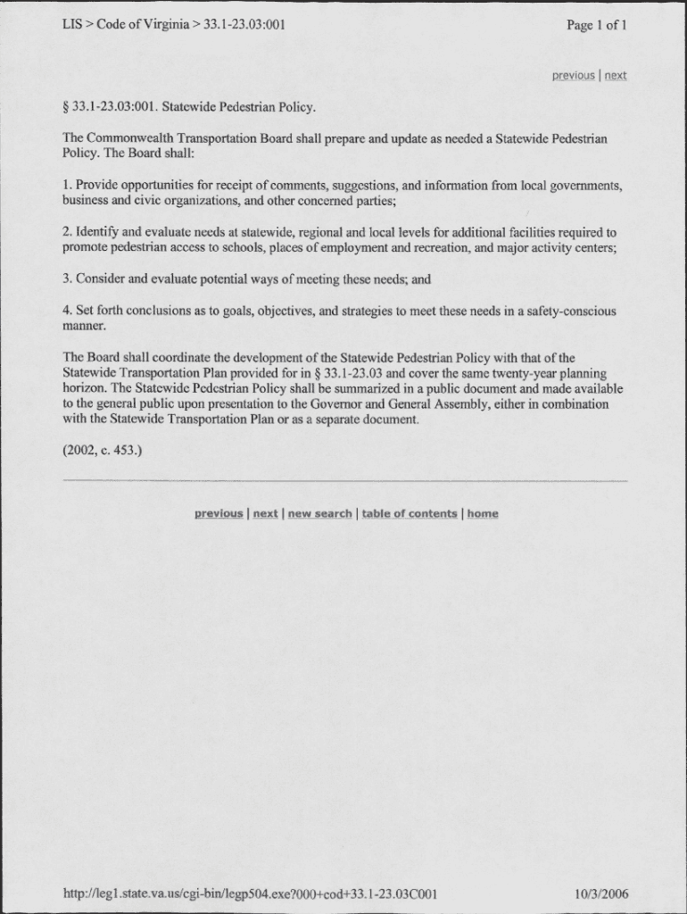 IS Code of Virginia 33.123.03:001Page 1 of Previous next 33.123.03:001. Statewide Pedestrian Policy. The Commonwealth Transportation Board shall prepare and update as needed a Statewide Pedestrian