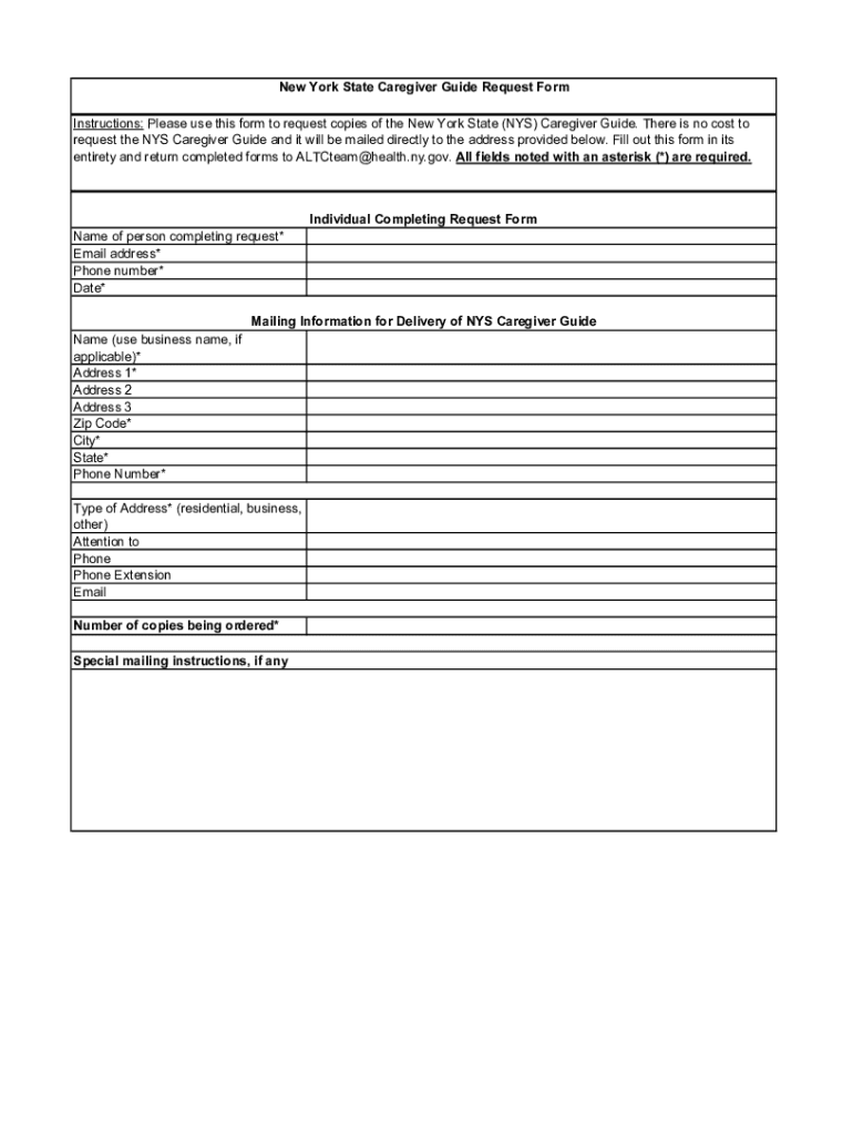 New York State Caregiver Guide Request Form Instructions: Please use this form to request copies of the New York State (NYS) Caregiver Guide. There is no cost to request the NYS Caregiver Guide, and