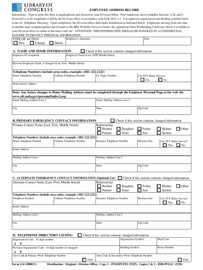 EMPLOYEE ADDRESS RECORD Instructions: Type or print this form in quadruplicate and forward to your Division Office. New employees are to complete Sections A, B, and C. Section D is to be completed