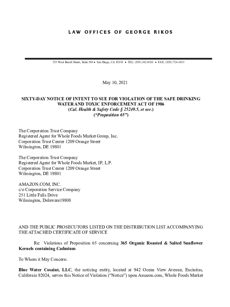 L AW % O F F I C E S % O F % G E O KG E % R I KO S555 West Beech Street, Suite 500 San Diego, CA 92101 TEL: (858) 3429161 FAX: (858) 7241453May 10, 2021 BIRTHDAY NOTICE OF INTENT TO SUE FOR VIOLATION
