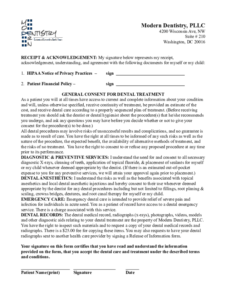 Modern Dentistry, LLC 4200 Wisconsin Ave, NW Suite # 210 Washington, DC 20016 RECEIPT & ACKNOWLEDGEMENT: My signature below represents my receipt, acknowledgement, understanding, and agreement with