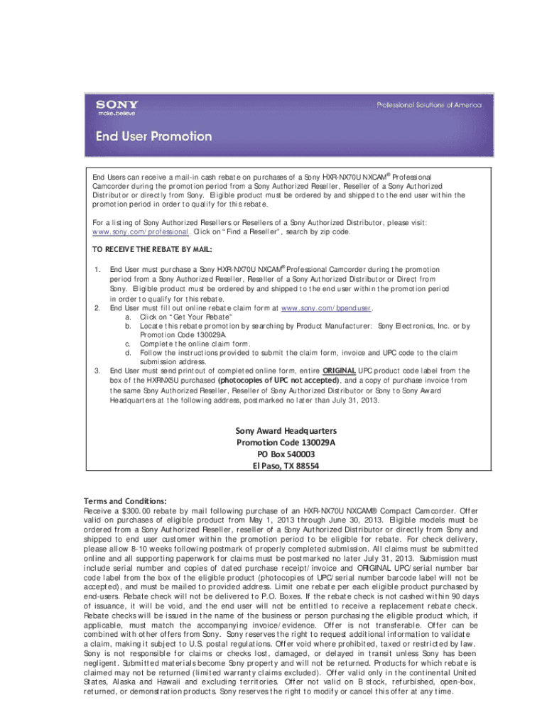 End Users can receive a mailing cash rebate on purchases of a Sony HXRNX70U NCAA Professional Camcorder during the promotion period from a Sony Authorized Reseller, Reseller of a Sony Authorized Distributor