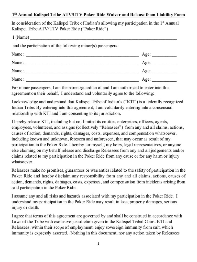 1St Annual Kalispell Tribe ATV/UTV Poker Ride Waiver and Release from Liability Form In consideration of the Kalispell Tribe of Indians allowing my participation in the 1st Annual Kalispell Tribe