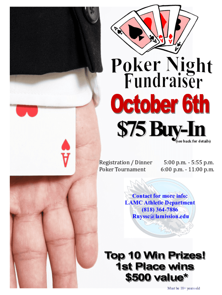 (see back for details)Registration / Dinner Poker Tournament5:00 p.m. 5:55 p.m. 6:00 p.m. 11:00 p.m. Contact for more info: LAMP Athletic Department (818) 3647886 Ruyssc@lamission.eduMust be 18+ years