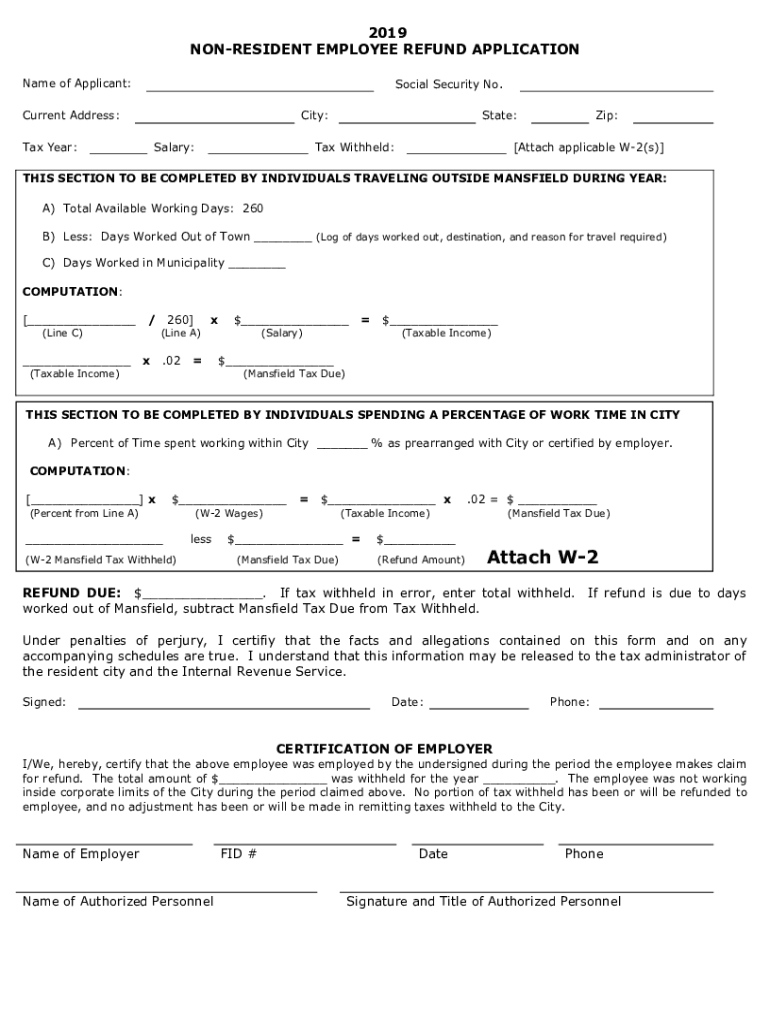 2019 NONRESIDENT EMPLOYEE REFUND APPLICATION Social Security No. Name of Applicant: Current Address:City:Tax Year:Salary:State:Tax Withheld:Zip:[Attach applicable W2(s)]THIS SECTION TO BE COMPLETED