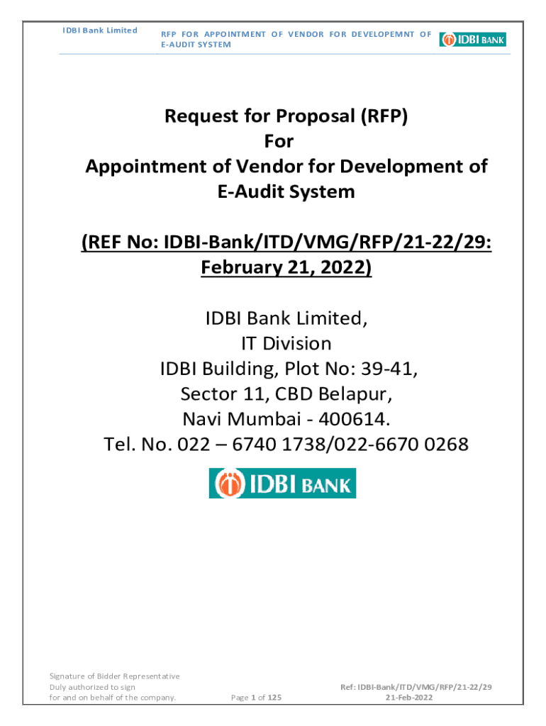 Get the free Request for Proposal (RFP) For Appointment of Vendor for ... - IDBI Bank