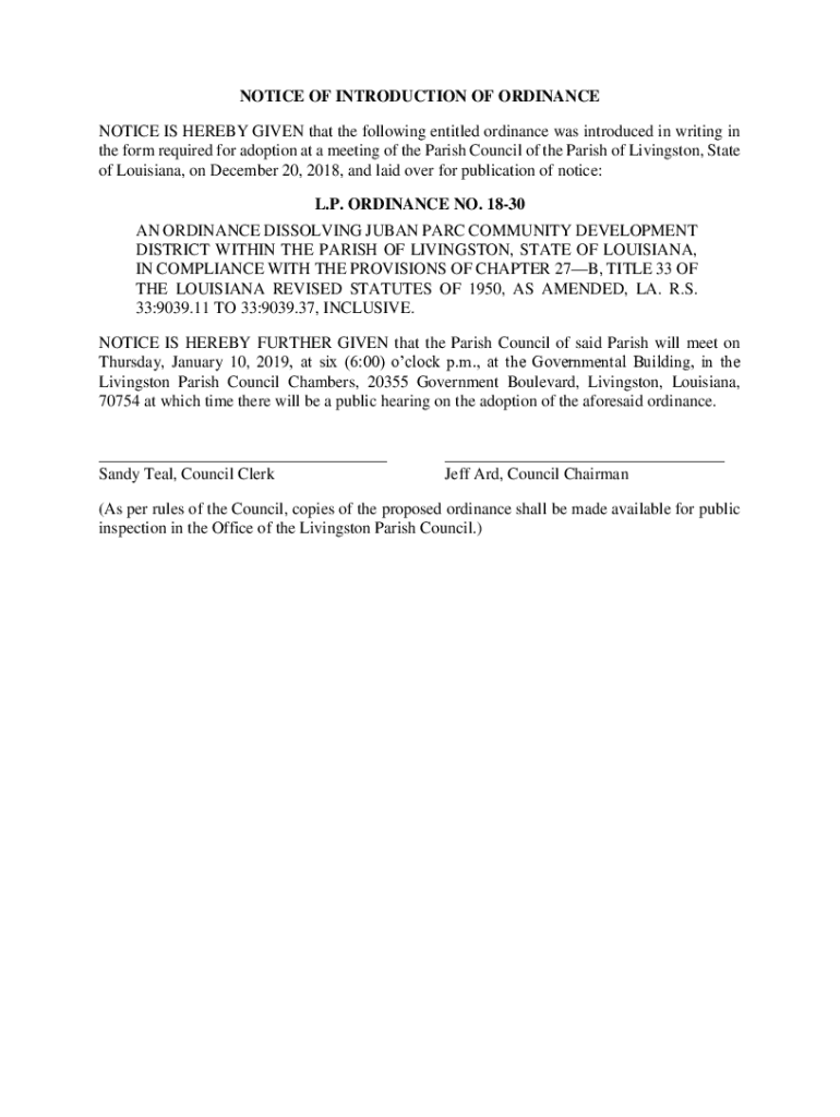 NOTICE OF INTRODUCTION OF ORDINANCE NOTICE IS HEREBY GIVEN that the following entitled ordinance was introduced in writing in the form required for adoption at a meeting of the Parish Council of the
