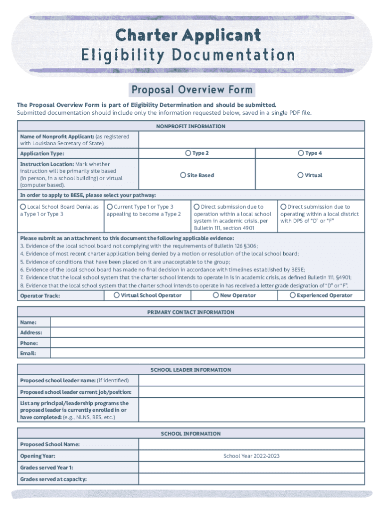 Proposal Overview Form The Proposal Overview Form is part of Eligibility Determination and should be submitted. Submitted documentation should include only the information requested below, saved in