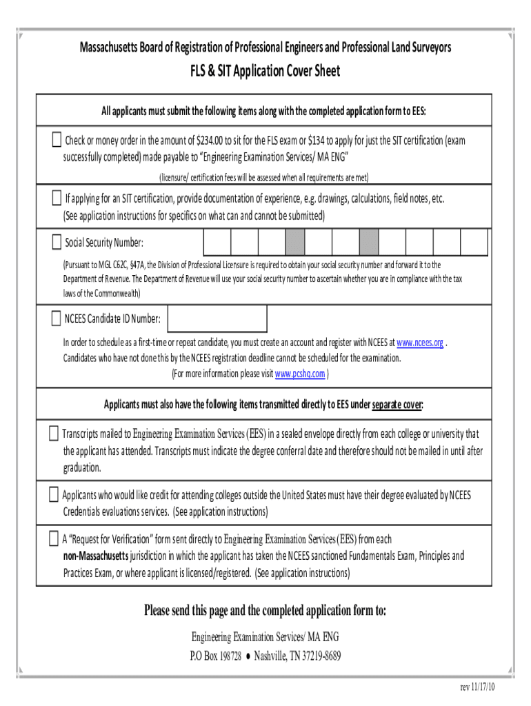 MassachusettsBoardofRegistrationofProfessionalEngineersandProfessionalLandSurveyorsFLS&SITApplicationCoverSheet AllapplicantsmustsubmitthefollowingitemsalongwiththecompletedapplicationformtoEES: Checkormoneyorderintheamountof$234.00tositfortheFLSexamor$134toapplyforjusttheSITcertification(exam