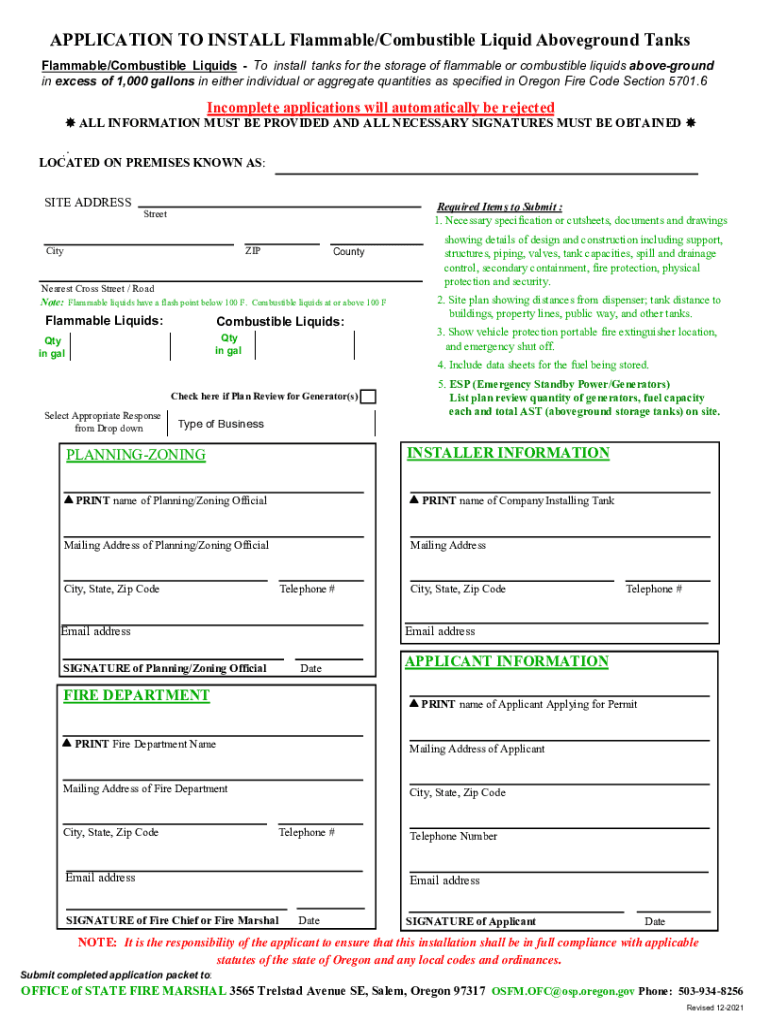 APPLICATION TO INSTALL Flammable/Combustible Liquid Above ground Tanks Flammable/Combustible Liquids To install tanks for the storage of flammable or combustible liquids above ground in excess of
