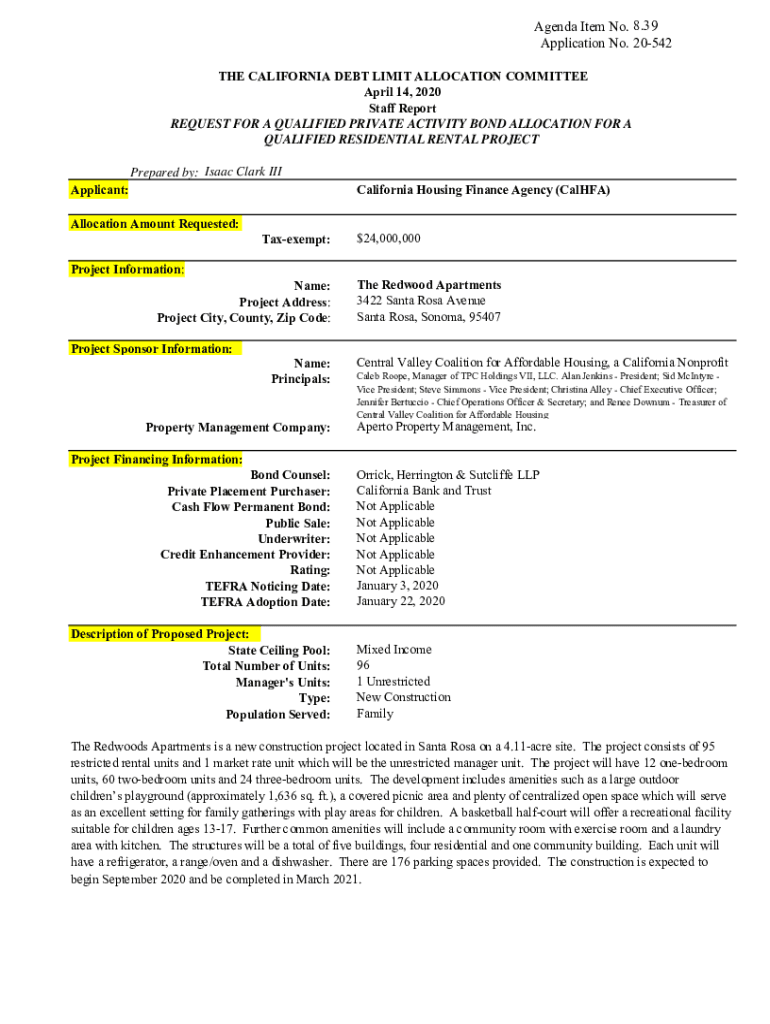 Agenda Item No. 8.39 Application No. 20542 THE CALIFORNIA DEBT LIMIT ALLOCATION COMMITTEE April 14, 2020, Staff Report REQUEST FOR A QUALIFIED PRIVATE ACTIVITY BOND ALLOCATION FOR A QUALIFIED RESIDENTIAL