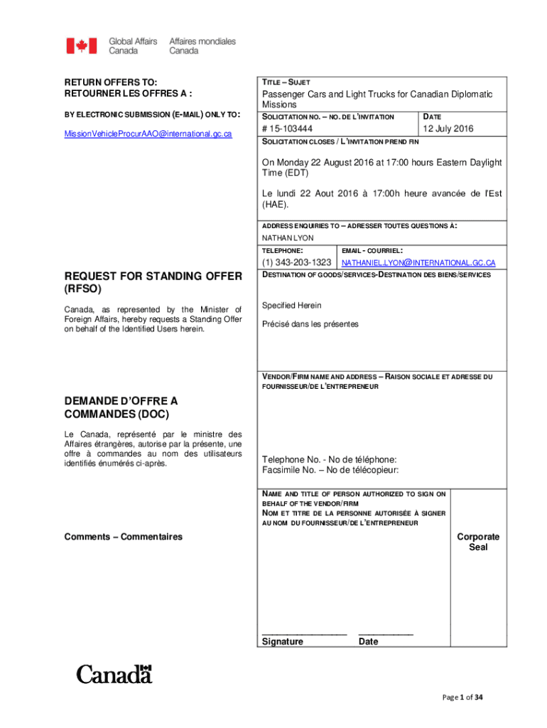 RETURN OFFERS TO: RETURNER LES OFF RES A :TITLE SURETY ELECTRONIC SUBMISSION (EMAIL) ONLY TO:SOLICITATION NO. NO. DE LINVITATIONDATE# 1510344412 July 2016MissionVehicleProcurAAO@international.gc.caPassenger